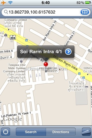 สมมุติกรณีตัวอย่างนี้ผมอยากจะรู้น่ะครับว่า นาเดีย ข้าวหมกไก่ ในตำนาน (ตำเร็วหน่อยไม่ได้เหรอครับนั่นโอ้ว ..มุก ) นี่มันอยู่ที่ไหนกันแน่ ? ประมาณว่า อยากได้พิกัดเพราะว่าจะได้ไปถูกหรือว่าจะได้เอาไปจิ้มหรอกใส่ GPS Garmin ตัวโปรดของผม แล้วเราก็กดไปที่ more info. ต่อครับ เราก็จะเห็นเป็นภาพแผนที่พร้อมหมุดสีแดงปักเอาไว้ ก็ให้กดหัวหมุดสีแดงอีกที มันก็จะใหญ่ขึ้น แล้วเราก็มีกดเครื่องหมายลูกศรสีฟ้าต่อเพื่อให้มันไปเปิดที่ Google Maps App จริงๆอีกทีหนึ่ง แค่นี้เราก็จะได้เลขหวยที่ออกเป็นพิกัดแสดงไว้ที่ด้านบนแล้วล่ะครับ เท่านี้ผมก็เอาไปกรอกใน GPS เพื่อจะได้ไป ร้านข้าวหมกไก่นาเดียในตำนาน ได้แล้ว อิอิ ..