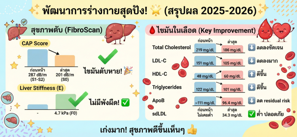 คุณภาพ Lipid Profile ดีกว่าแต่ก่อนมาก : จากที่ไม่เคยทำให้ค่า LDL กลับมาใกล้ 100 ได้เลยนานกว่า 15 ปี เราสามารถทำให้ค่านี้มาแตะได้แล้ว แม้ว่าตอนนี้จะเท่ากับ 105 คิดว่าอีกไม่นานนักก็อาจจะต่ำไปกว่านี้ได้ โดยอาจะกำหนดเป้าเอาเองว่า อยากจะได้สัก 70 ก็ยังดี เพราะ อะไรถึงคิดแบบนั้น ตอนนี้ เรารู้เพิ่มอีกแล้วว่า LDL ไม่ได้เป็นตัวกำหนดความเสี่ยงหลอดเลือดหัวใจปัจจัยเดียวหรอก แต่มันเป็นฐานที่ทำให้ค่า plaque แบบนิ่มนั้นลดปริมาณการสะสมลงไปได้อีก ถ้าหากว่ายิ่งน้อยก็ยิ่งดี โดยปกติแล้ว คนที่ป่วยมีการับยา มันอาจจะต่ำได้ราว 50 ทีเดียวแต่นี่สำหรับคนไม่ได้ใช้ยาที่เป็นเม็ดๆ เราเลือกใช้ ยาจากการออกแรงหนักแทน ก็อาจจะไม่ได้ผลได้ถึงแบบนั้นหรอก (มั้ง) เป็นเพียงการคาดเดาเอาไปแค่นั่น